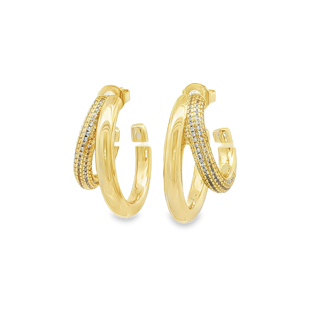 Un par de aretes audaces con acabado en baño de oro 14K sobre brass, que combinan volumen y brillo con un diseño moderno. Ideales para transformar un outfit sencillo en un look lleno de presencia y sofisticación.