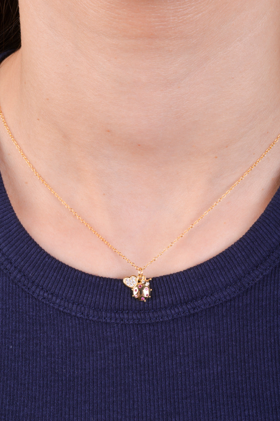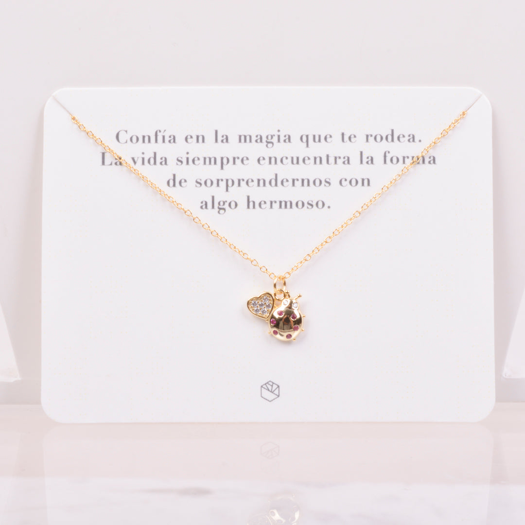 Este collar con catarina y corazón simboliza buena suerte, amor y la certeza de que la vida siempre encuentra la forma de sorprenderte con algo hermoso. La catarina representa esperanza y protección; el corazón, amor y gratitud.