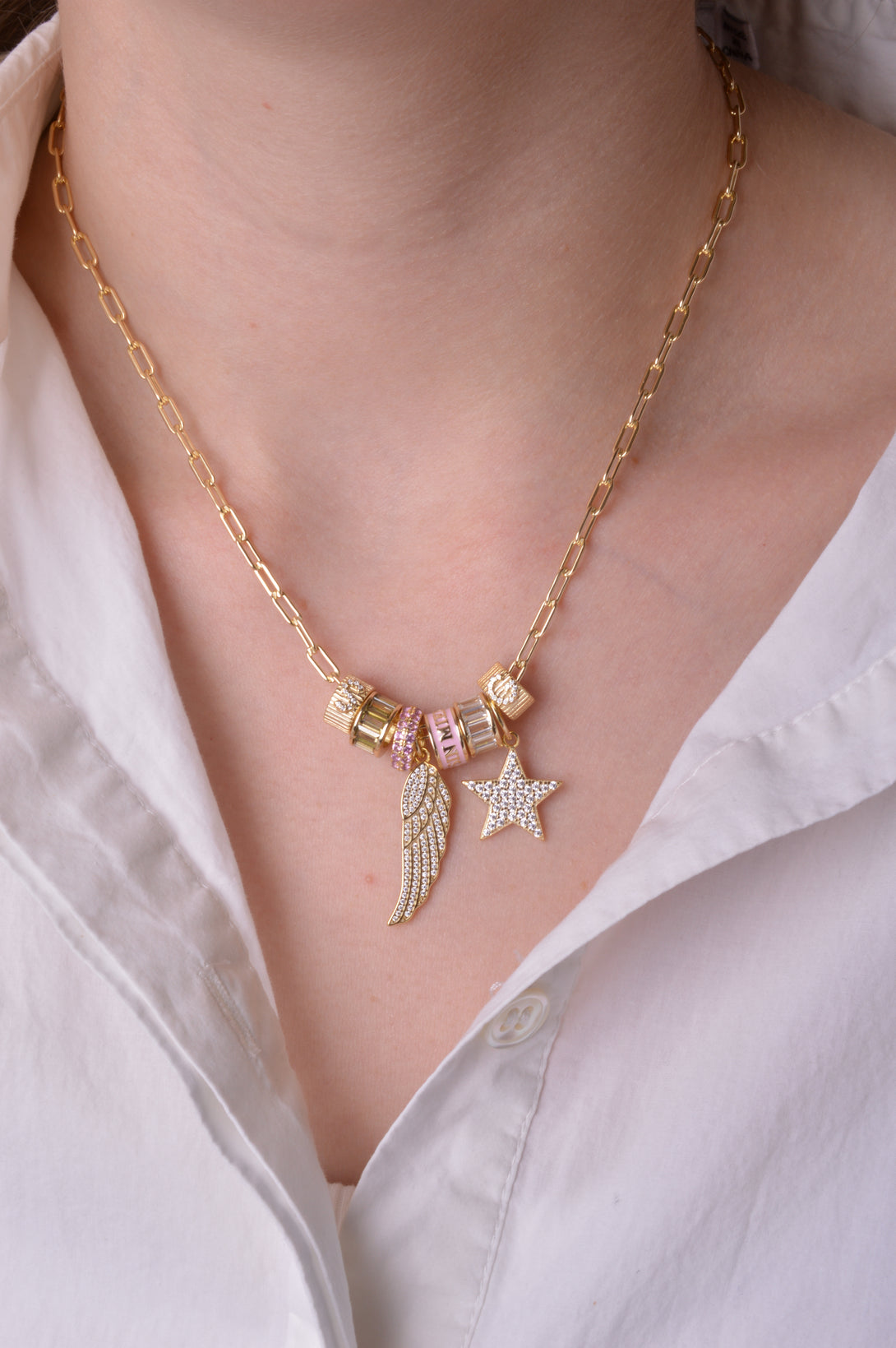 Combínalo con nuestro collar de eslabones y agrega tus charms de palabras o iniciales para crear una pieza que refleje tu energía.