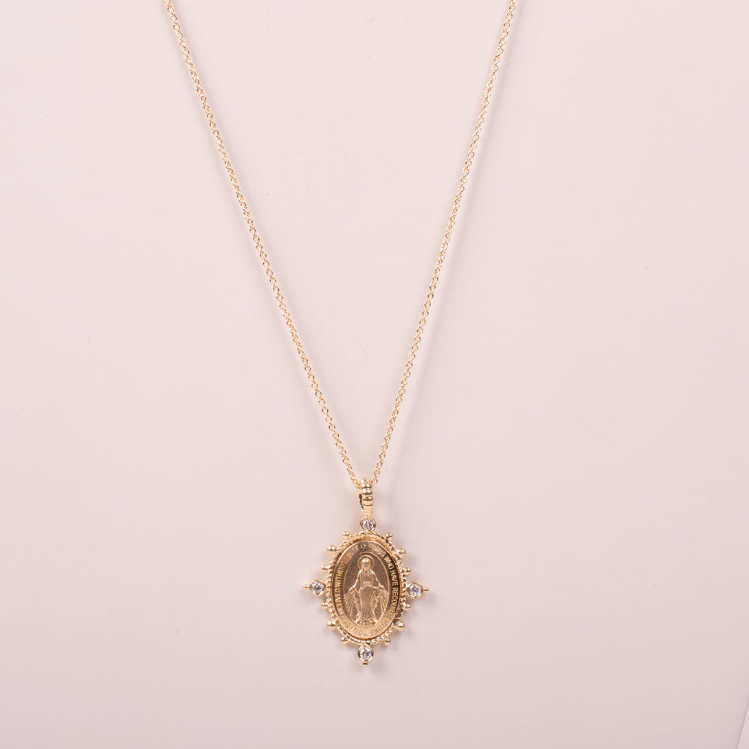 Un diseño clásico y atemporal: medalla de la Virgen en oro amarillo 14KT, rodeada de 4 diamantes naturales que aportan brillo sutil y elegante. Una pieza de fe y estilo que puedes llevar siempre cerca de ti. ✨