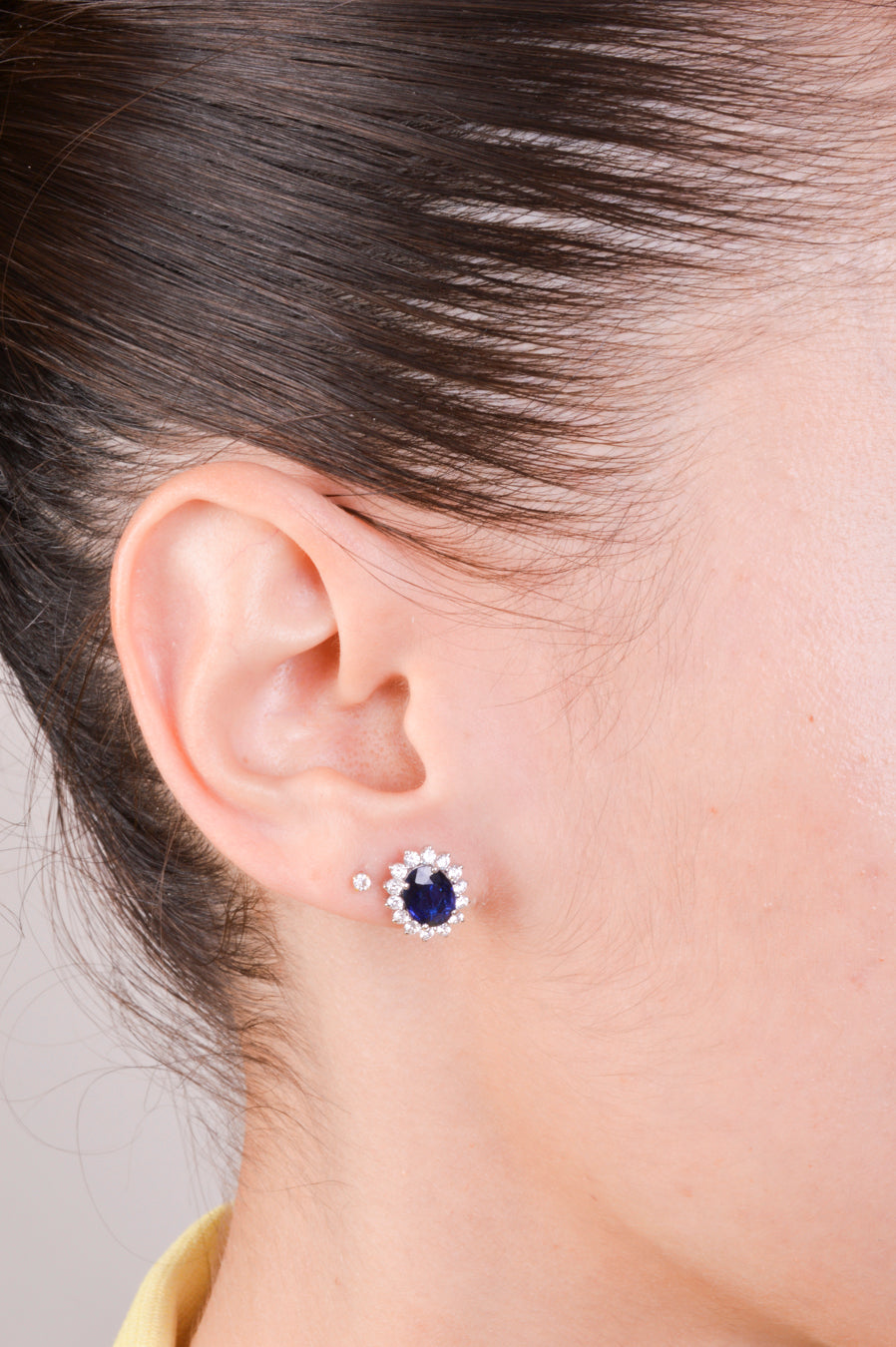 Un clásico eterno. Elaborados en oro blanco 18KT, con 2 zafiros (2.44 ct) de un azul profundo y rodeados de 28 diamantes (0.70 ct) que aportan luz y sofisticación. Una joya que combina elegancia atemporal con un brillo moderno.