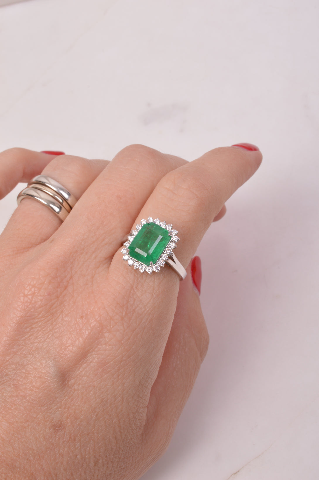 Un diseño imponente y elegante que captura miradas al instante. La pieza central es una esmeralda natural de 3.800 quilates, enmarcada por un halo de 22 diamantes redondos (0.460 quilates en total) que resaltan su color intenso y vibrante. Todo montado sobre oro blanco de 18 quilates, con un peso total de 4.643 g.