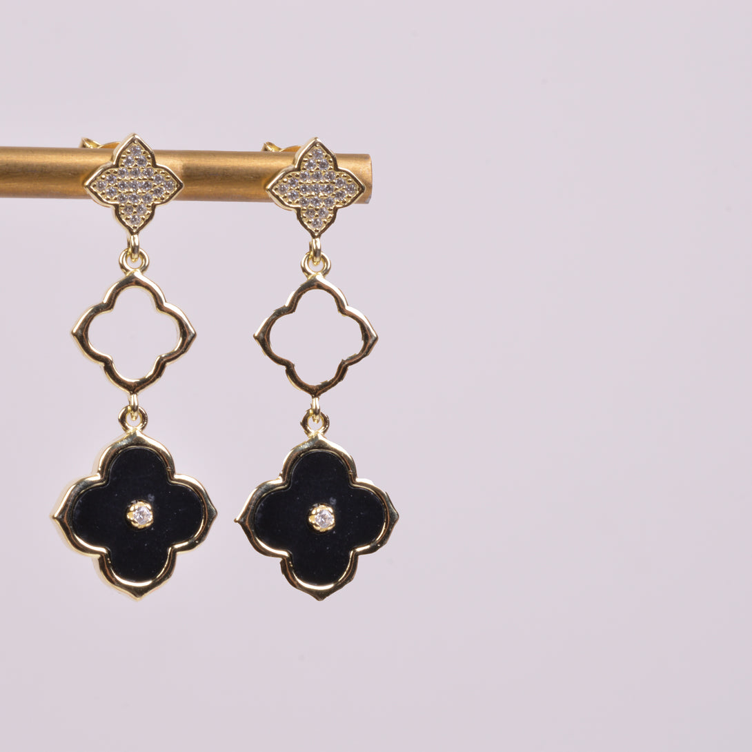 25-0234 Aretes largos tres flores onix dorado
