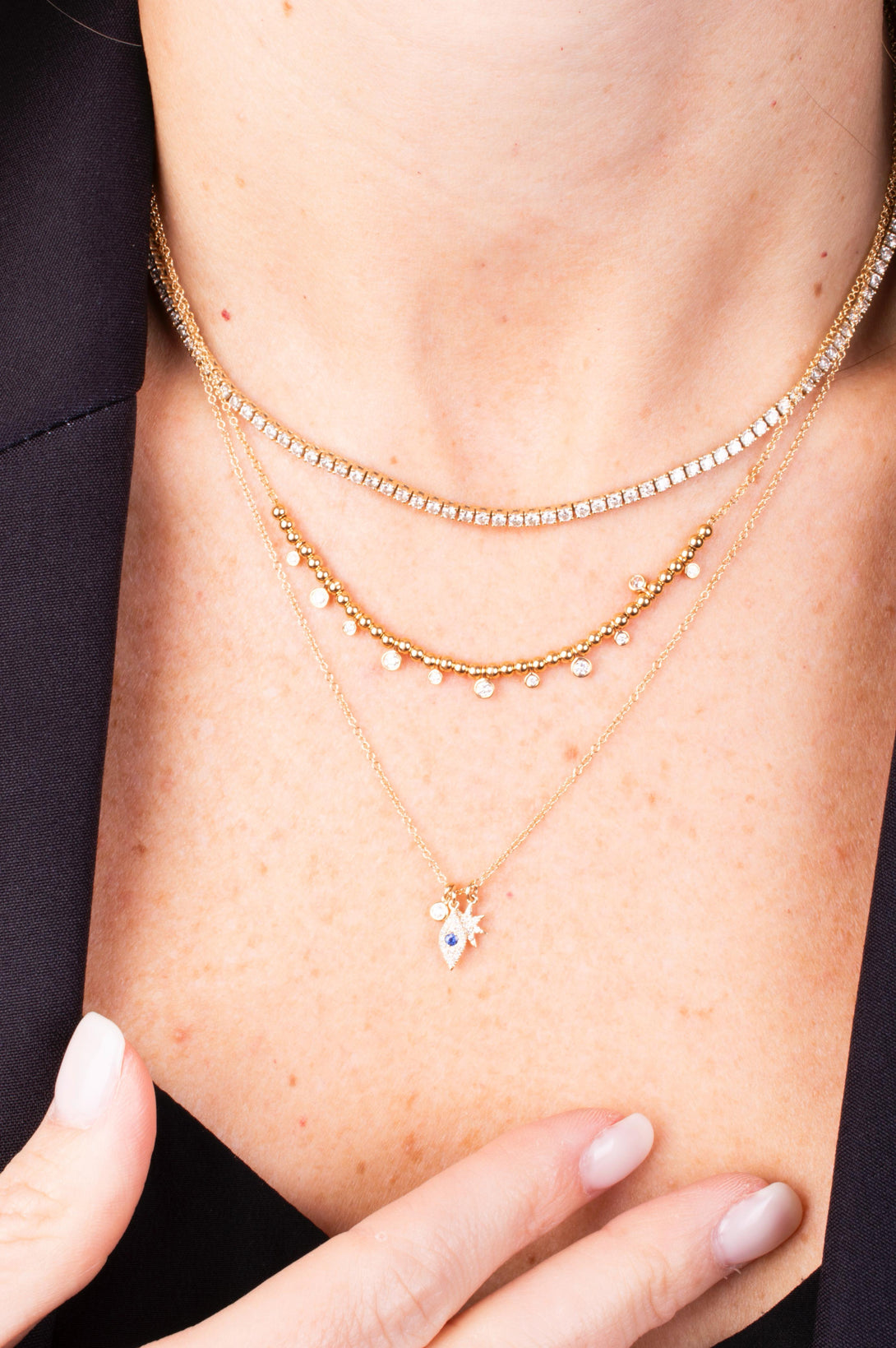 El oro amarillo 14k sostiene tres charms llenos de brillo: un círculo con un diamante redondo (0.02 ct), una estrella con 33 diamantes redondos (0.08 ct) y un ojo con un zafiro redondo (0.04 ct) rodeado de diamantes. Con un peso total de 1.82 g, este collar es un diseño moderno y versátil que combina símbolos icónicos con un toque chic y elegante.