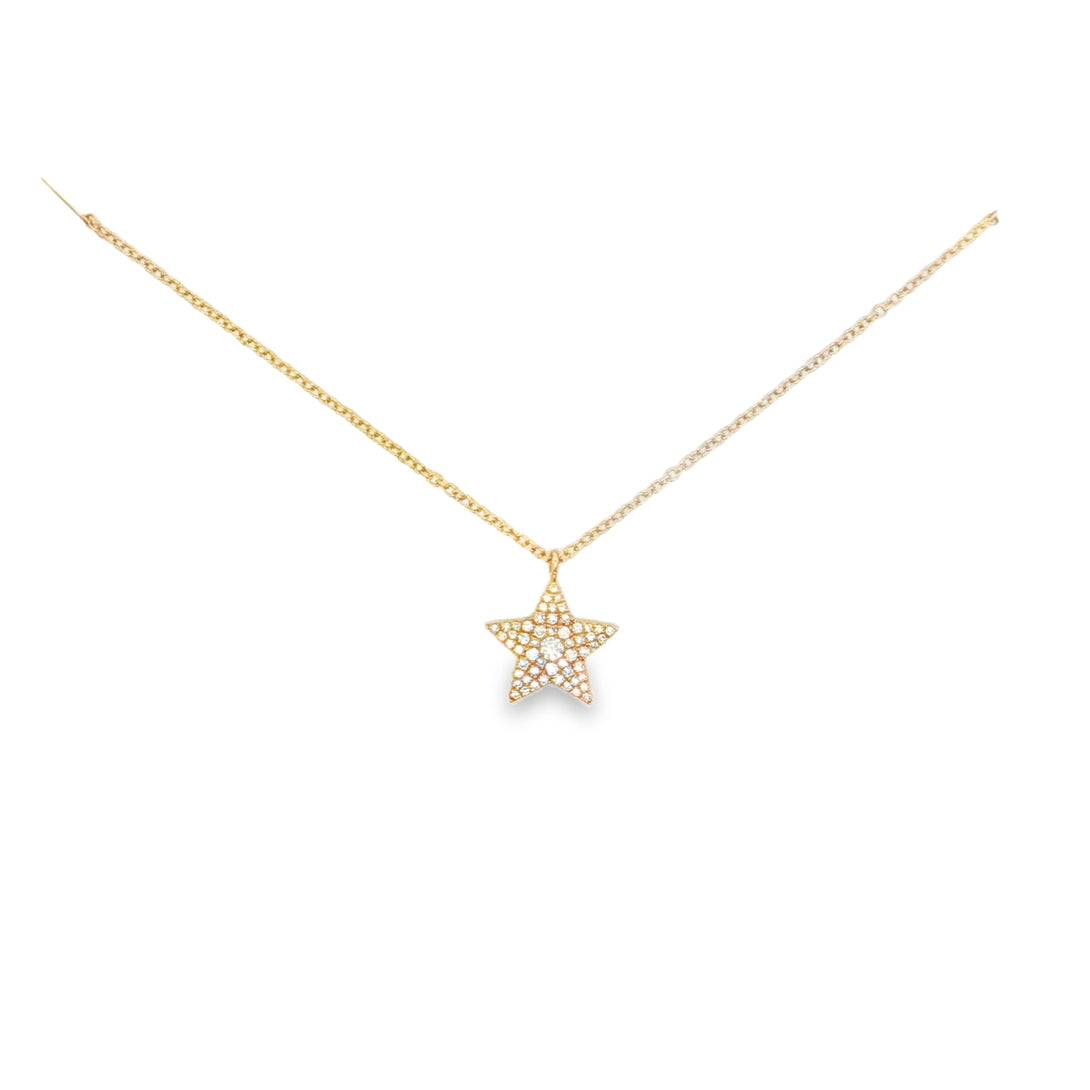 El oro amarillo 14kt enmarca una estrella pavé con 6 diamantes corte brillante (0.07 ct) y 50 diamantes single cut (0.11 ct). Con un peso de 1.86 g, es un diseño moderno y luminoso que aporta el toque perfecto para cualquier ocasión.