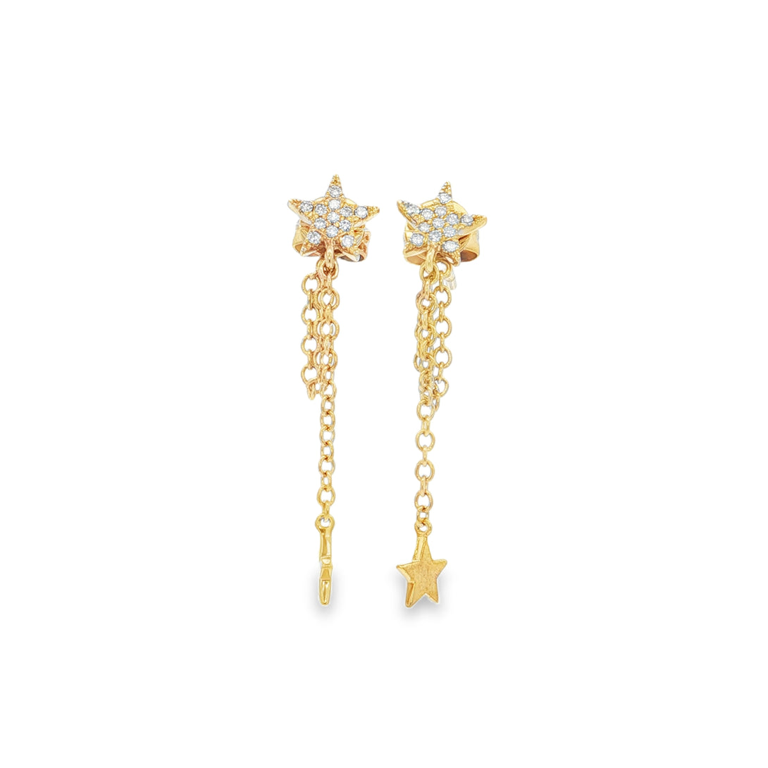 En oro amarillo 14kt, estos aretes de estrella pavé están engastados con 24 diamantes single cut (0.07 ct). Con un peso de 1.77 g, destacan por su diseño asimétrico con cadenas colgantes que aportan movimiento y un estilo moderno y chic.
