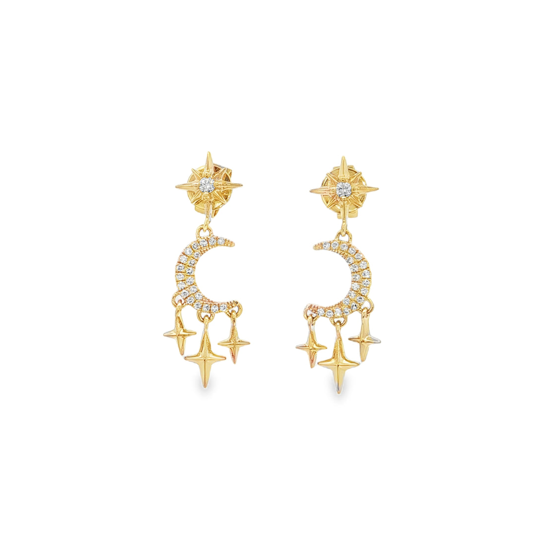 En oro amarillo 14kt, estos aretes combinan una estrella central engastada con diamante y una luna pavé con colgantes de estrellas. Están adornados con 2 diamantes corte brillante redondo (0.05 ct) y 42 diamantes single cut (0.09 ct). Con un peso total de 2.42 g, su diseño celestial aporta brillo y movimiento chic, perfecto para elevar cualquier look.