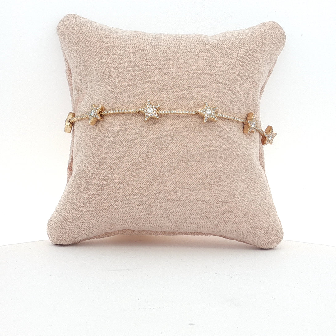 En oro amarillo 14kt, esta pulsera combina el encanto de las estrellas con el brillo de los diamantes. Está engastada con 7 diamantes corte brillante redondo (0.25 ct) y 236 diamantes single cut (0.59 ct), logrando un pavé luminoso y delicado. Con un peso de 5.74 g, es un diseño sofisticado y versátil que brilla con cada movimiento.