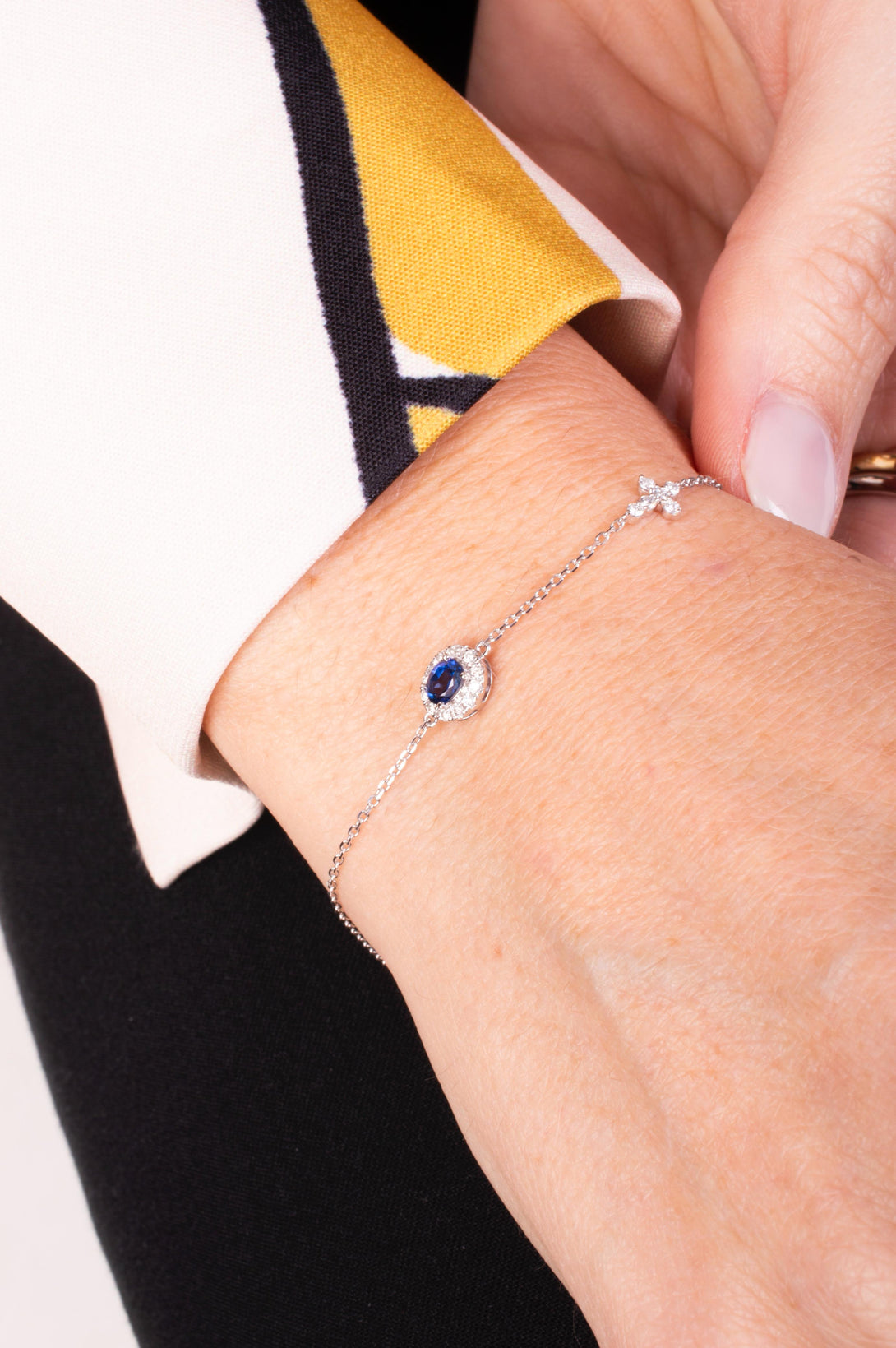 En oro blanco 18kt, esta pulsera combina el brillo de los diamantes con la intensidad azul del zafiro. El diseño presenta un zafiro oval engastado al centro (0.300ct) rodeado por un halo pavé de diamantes y un detalle lateral de cruz con seis diamantes adicionales (0.150 ct total), creando un contraste elegante y sofisticado.