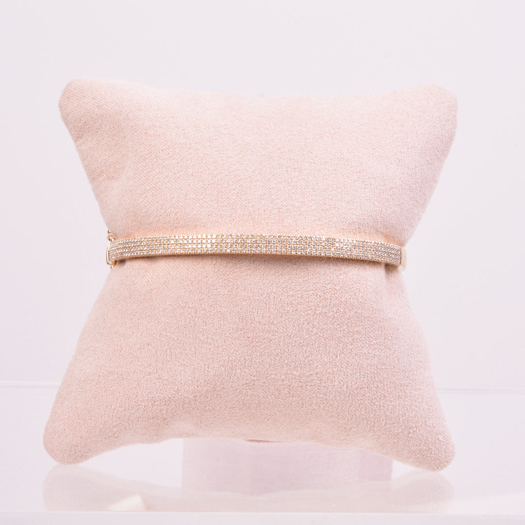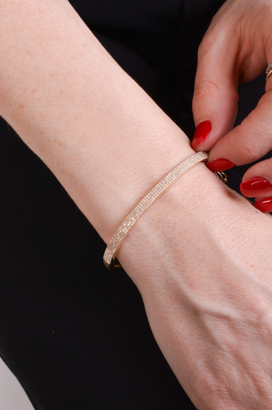 Una pieza icónica en oro amarillo 14KT con 308 diamantes redondos naturales (0.69 ct total) que envuelven la pulsera en brillo. Con 10.58 , es un clásico atemporal con presencia y elegancia. Diámetro de 57x46 mm.