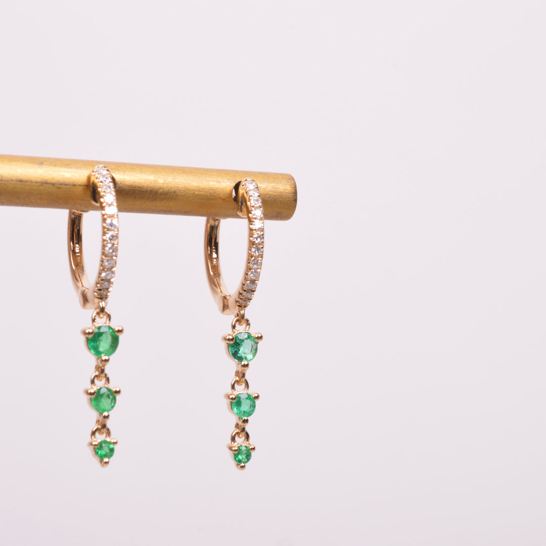 Estas arracadas en oro amarillo 14KT destacan por el contraste entre el brillo de 24 diamantes redondos naturales (0.07 ct total) y la fuerza vibrante de 6 esmeraldas redondas naturales (0.22 ct total). Con un peso de 1.34 g y medida de 11 mm, son el balance perfecto entre sutileza y statement: delicadas, coloridas y llenas de intención.