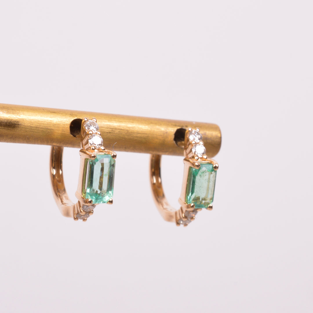Estas arracadas en oro amarillo 14KT destacan por el contraste entre la fuerza del verde profundo de 2 esmeraldas naturales (0.63 ct total) y el brillo sutil de 8 diamantes redondos naturales (0.12 ct total). Con un peso de 1.34 g y medida de 11 mm, son ideales para un look elegante y fresco.
