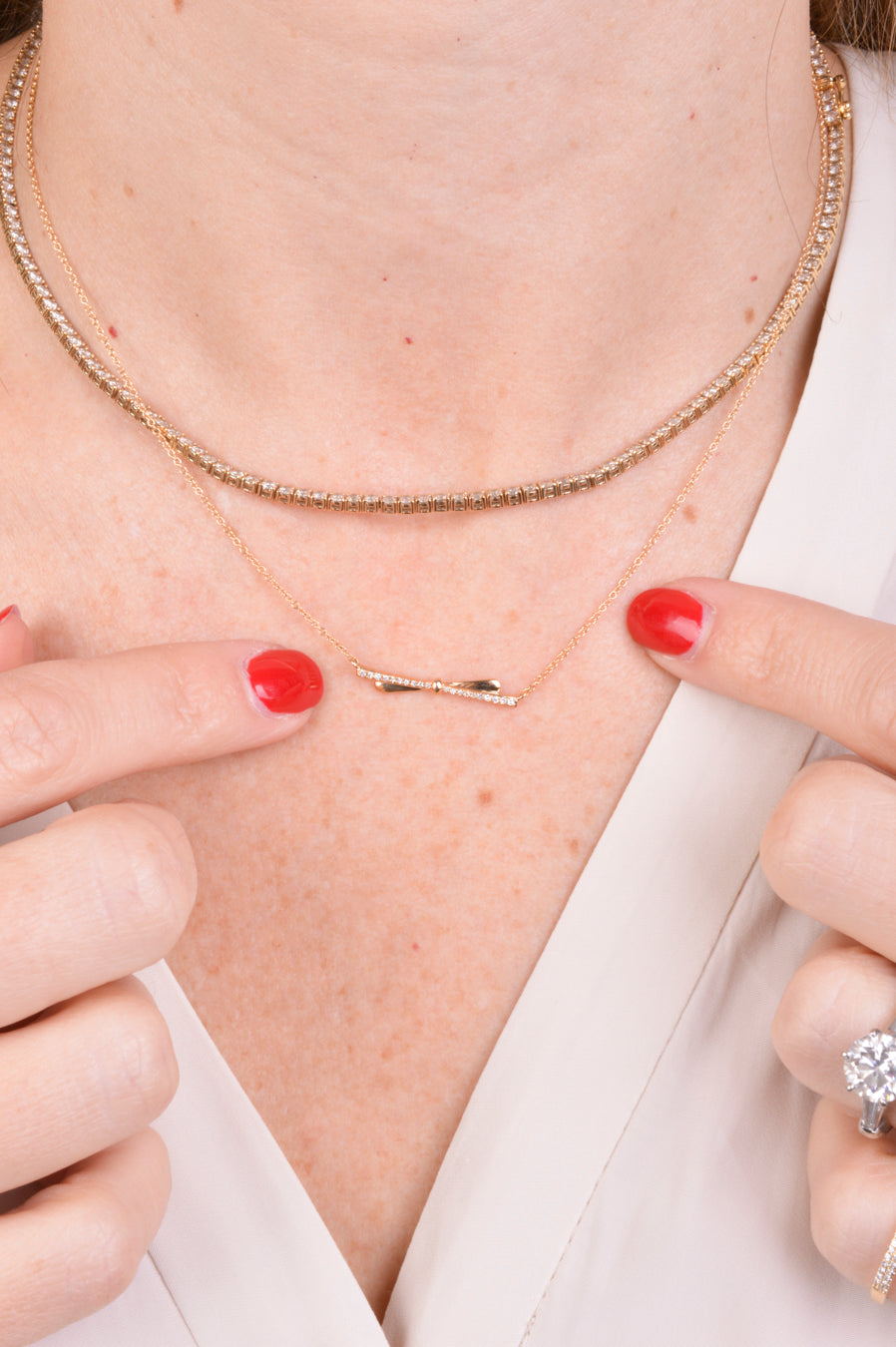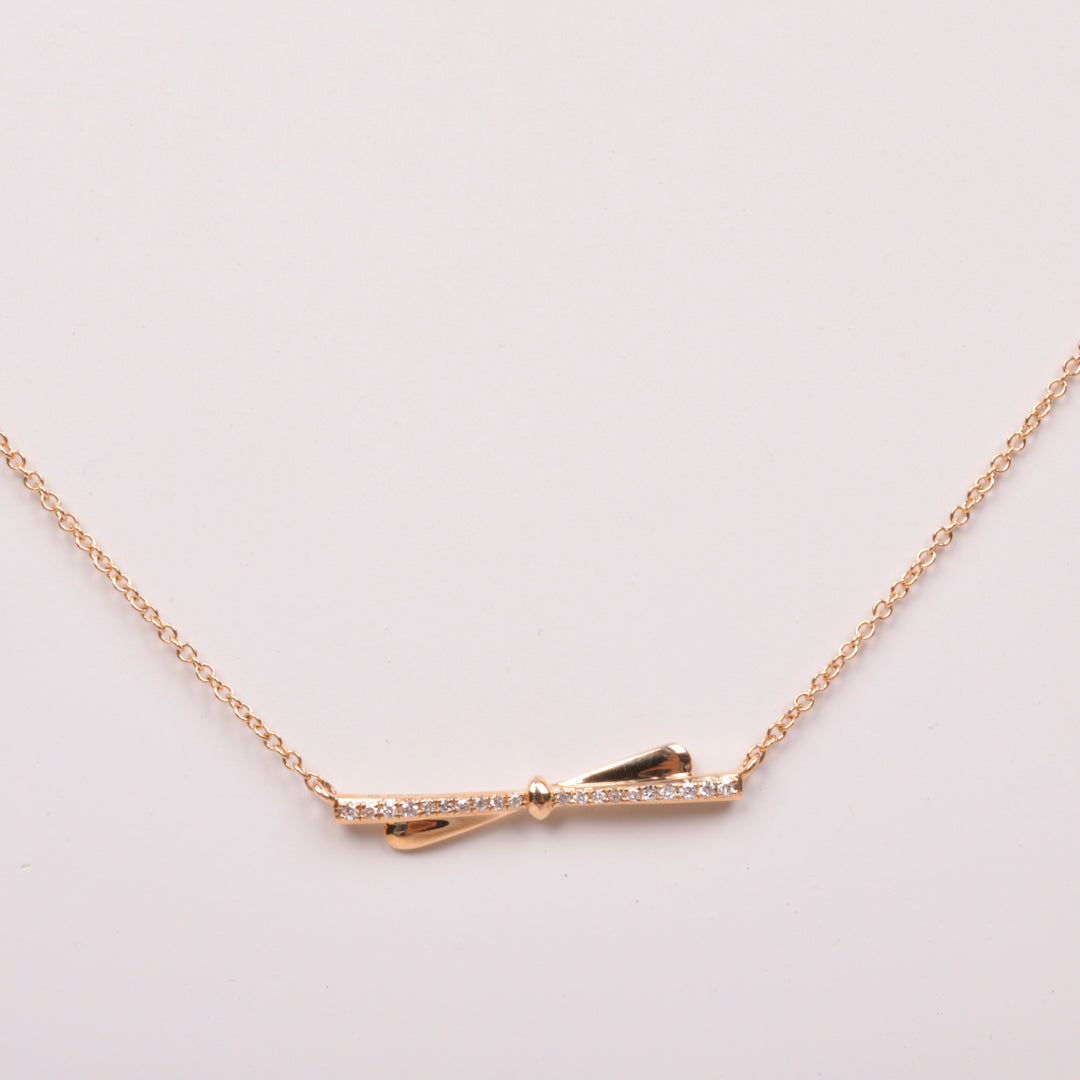 Collar de oro amarillo 14KT con un delicado lazo al frente, realzado con 20 diamantes naturales de 0.05 ct en total. Con un peso de 1.94 g y largo ajustable de 16+1+1 in, es perfecto para usar como pieza central o en layering, aportando un toque de lujo sin esfuerzo.