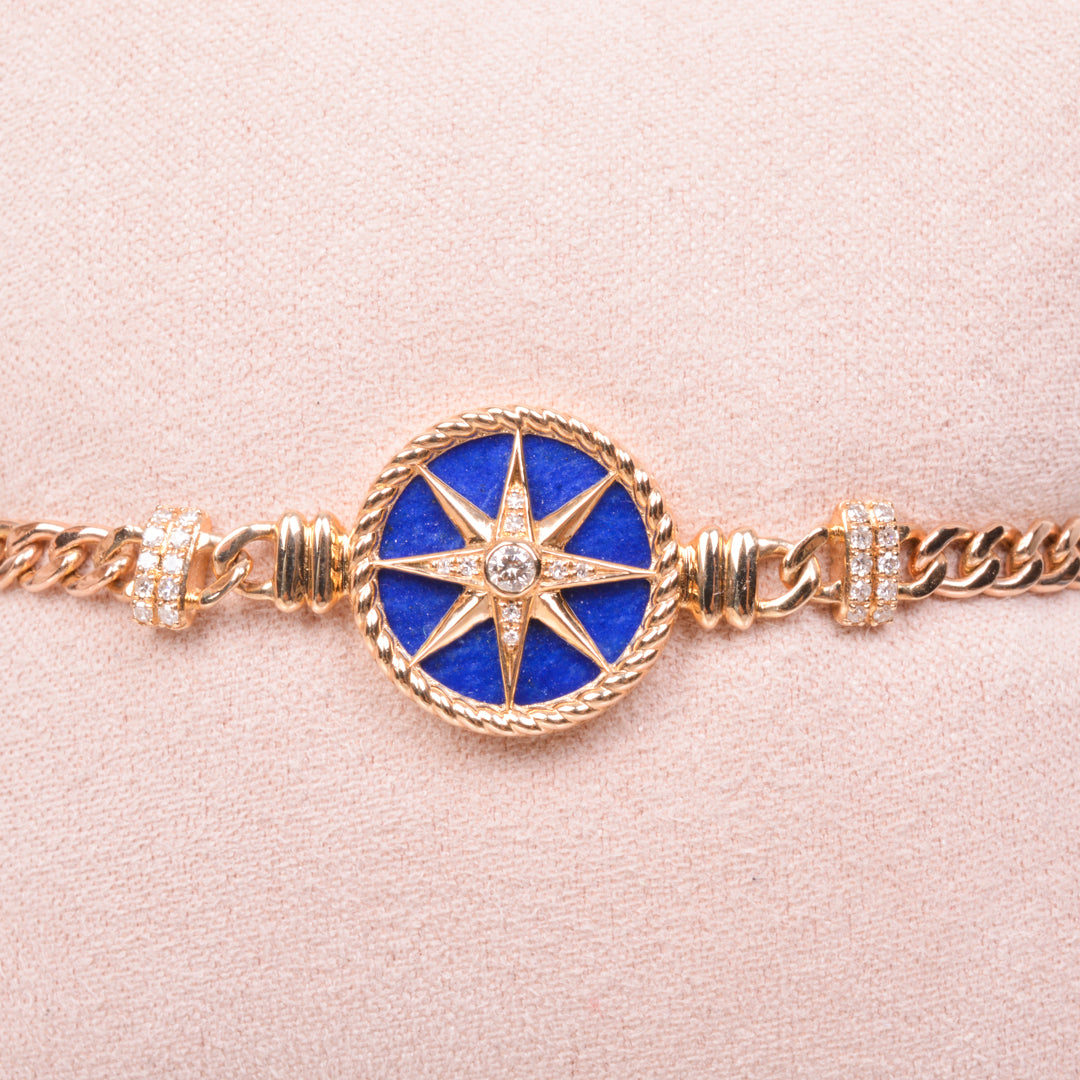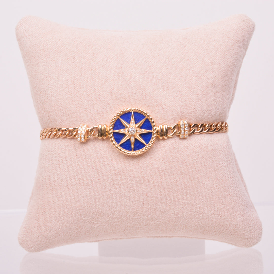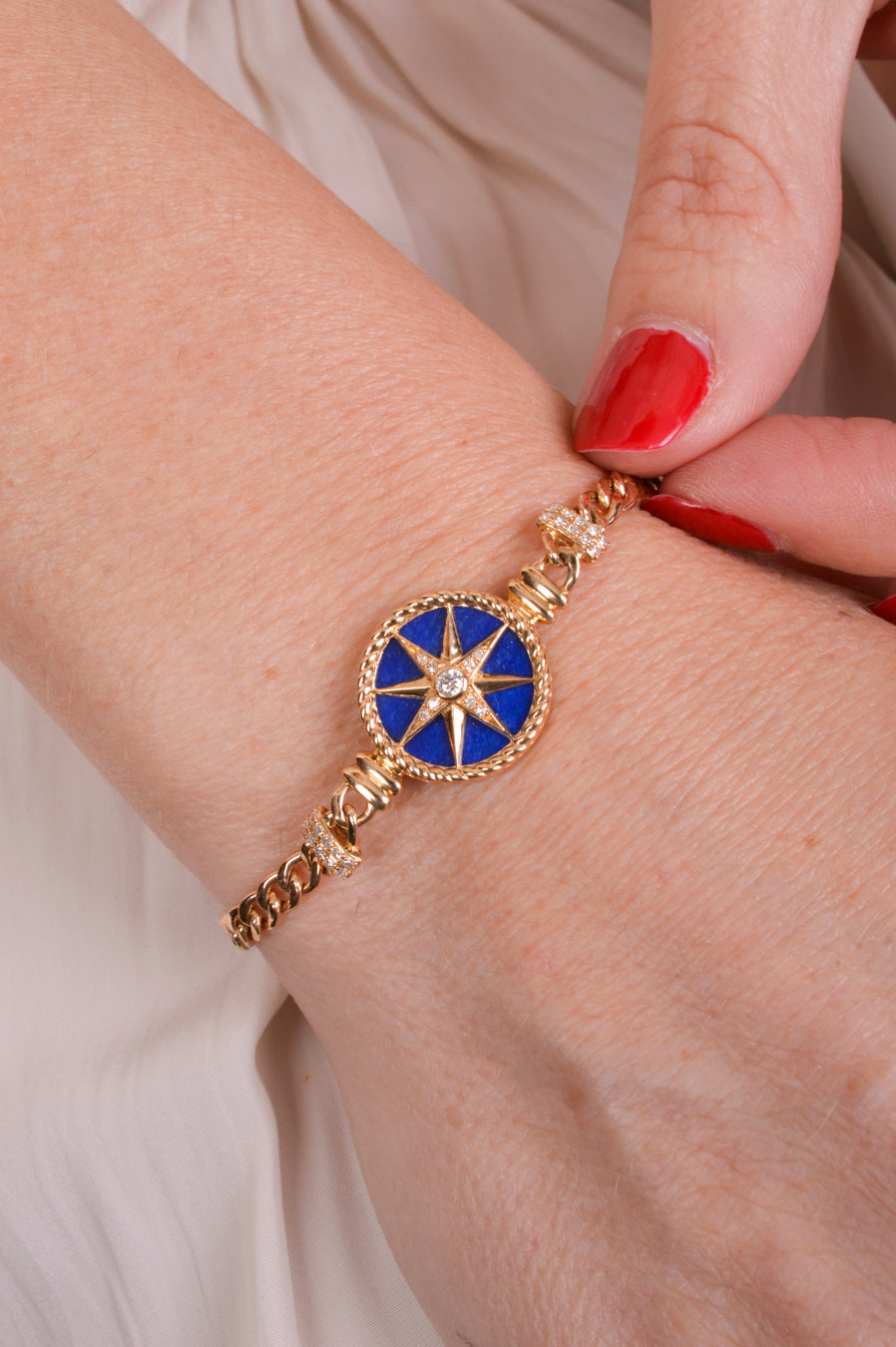 Esta pulsera en oro amarillo 14KT combina el brillo de 28 diamantes redondos (0.12 ct total) junto a un diamante central de 0.04 ct, enmarcando la intensidad azul profundo de un lapislázuli natural de 3.76 ct (aprox. 15.5 mm). Con un peso de 5.73 g y largo ajustable de 6+1 in, es una joya que equilibra lujo clásico con un toque moderno de color y fuerza.