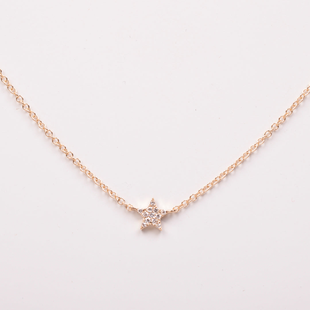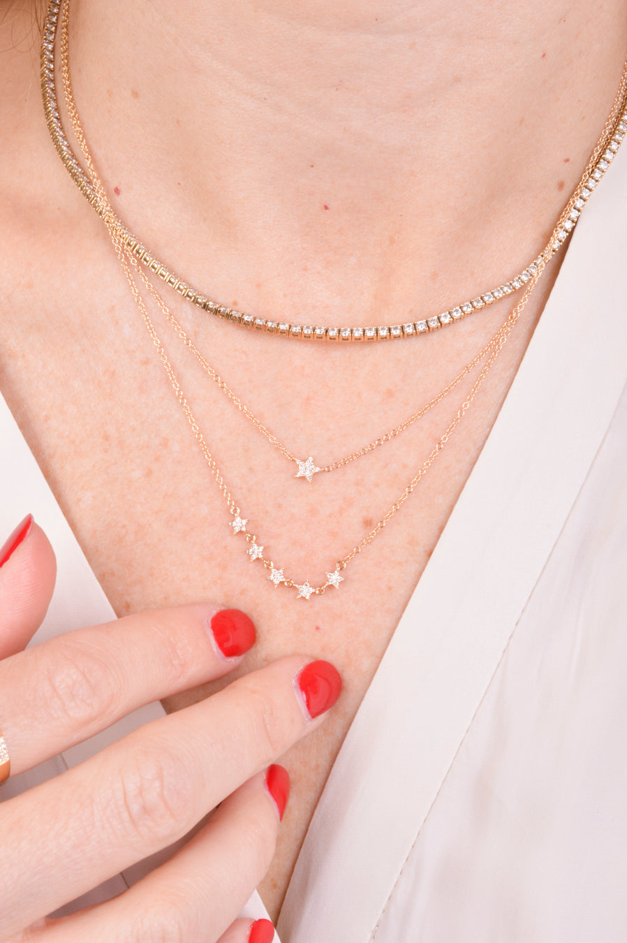 Este collar en oro amarillo 14KT está decorado con 12 diamantes redondos naturales (0.04 ct total) que aportan un brillo sutil y elegante. Con un peso de 1.52 g y largo ajustable de 16+1+1 in, es una pieza delicada que puede usarse sola como protagonista o en layering para un look moderno y chic.