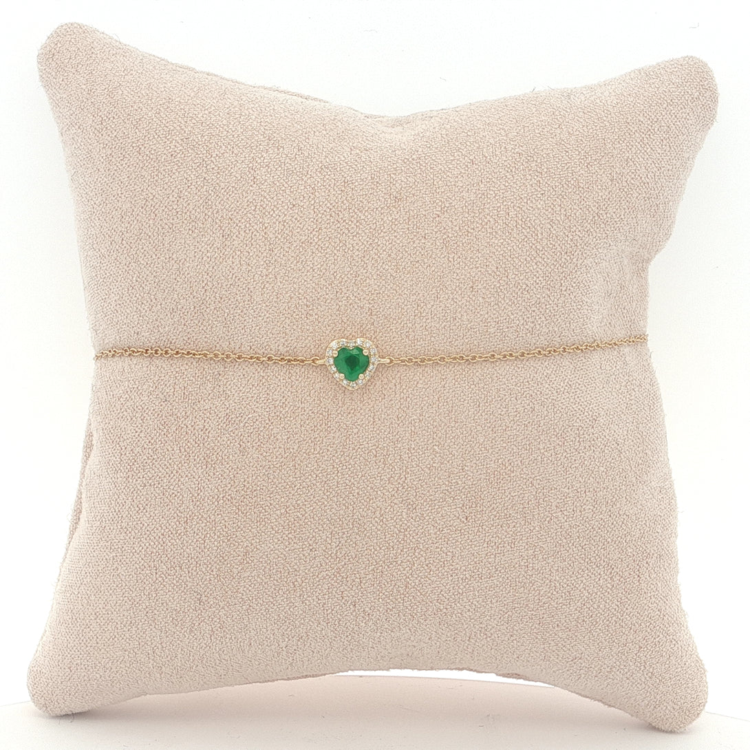 Esta pulsera en oro amarillo 14KT destaca por su esmeralda en forma de corazón (0.24 ct) en el centro, acompañada de 16 diamantes redondos naturales (0.03 ct total) que aportan un brillo sutil y elegante. Una pieza femenina y atemporal que se adapta a cualquier ocasión.