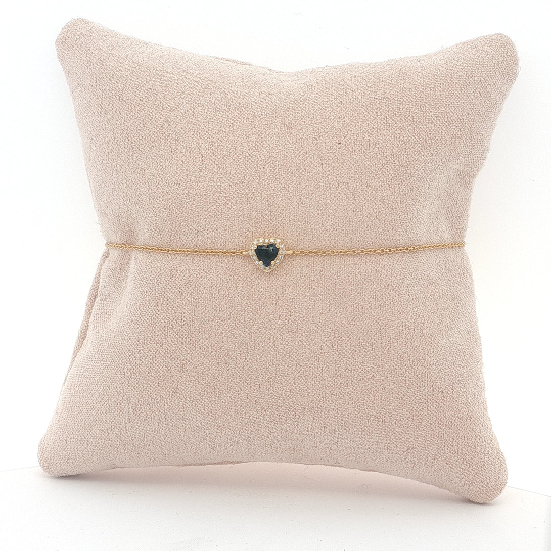 Inspirada en la conexión y el amor genuino, esta pulsera combina la calidez del oro amarillo 14KT con la profundidad de un zafiro en forma de corazón (0.29 ct), rodeado de 16 diamantes naturales (0.03 ct total) que iluminan cada movimiento. Es una joya delicada y significativa, creada para acompañarte en cada historia.