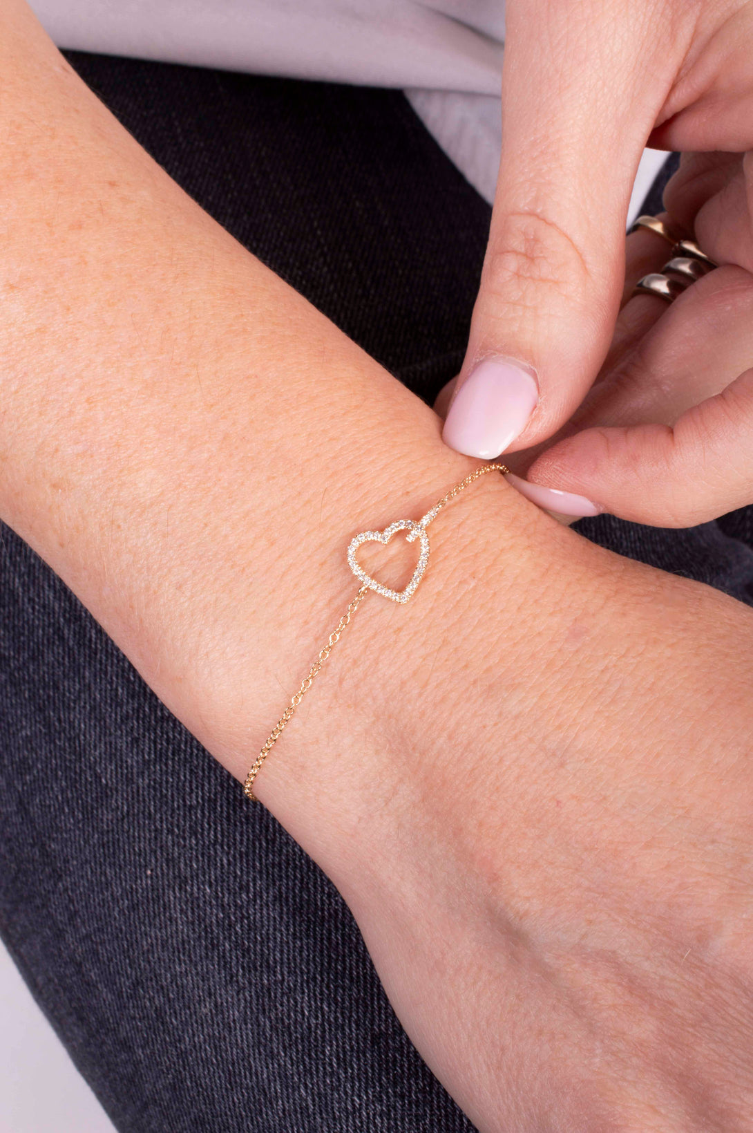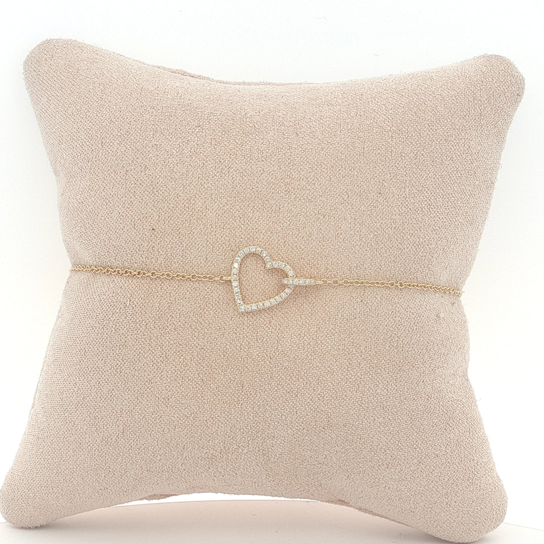 Esta pulsera de oro amarillo 14KT presenta un corazón con diseño de eslabón, engastado con 37 diamantes redondos naturales (0.10 ct total) que aportan el toque perfecto de luz. Su estilo combina el encanto clásico del corazón con la fuerza contemporánea del eslabón, ideal para usar sola o acompañada de otras pulseras.