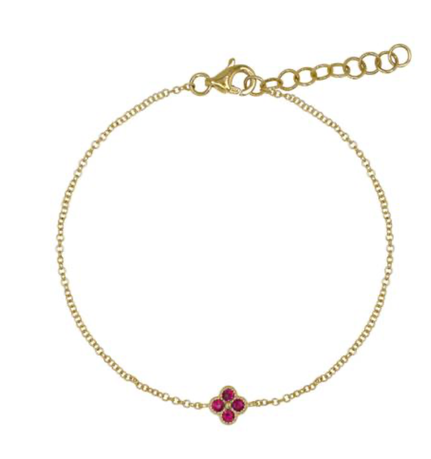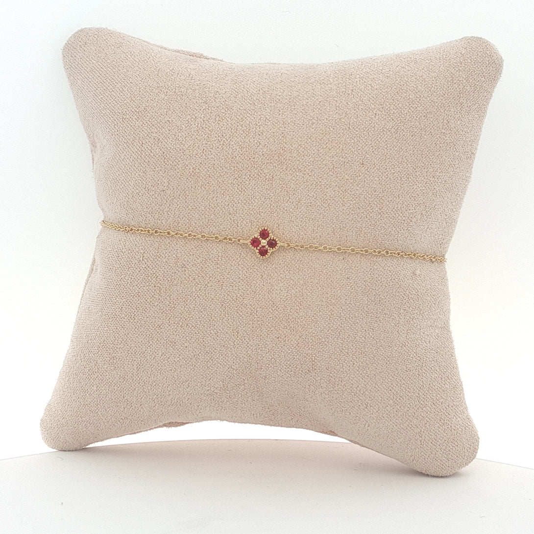 Esta pulsera de oro amarillo 14KT destaca un delicado trébol (clover) con rubíes naturales redondos (0.12 ct total), símbolo de pasión, amor y suerte. Su diseño minimalista y luminoso la convierte en una pieza ideal para elevar cualquier look, desde el día a día hasta una ocasión especial.