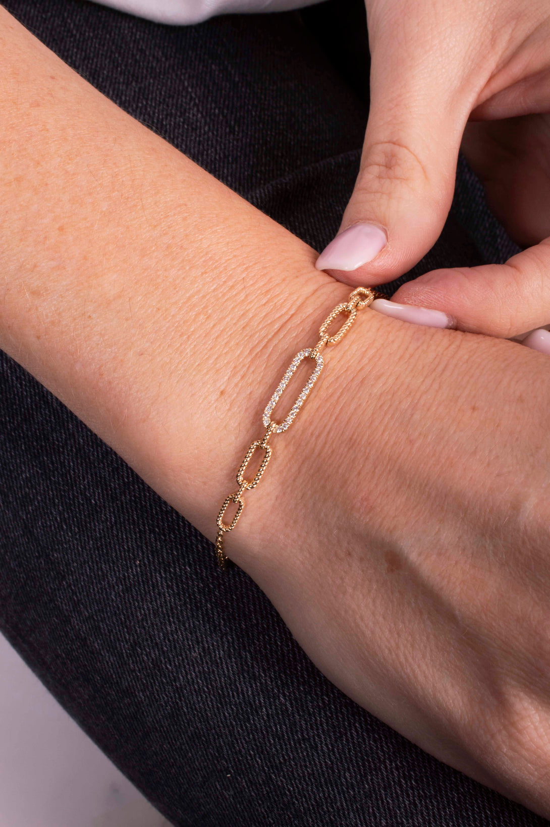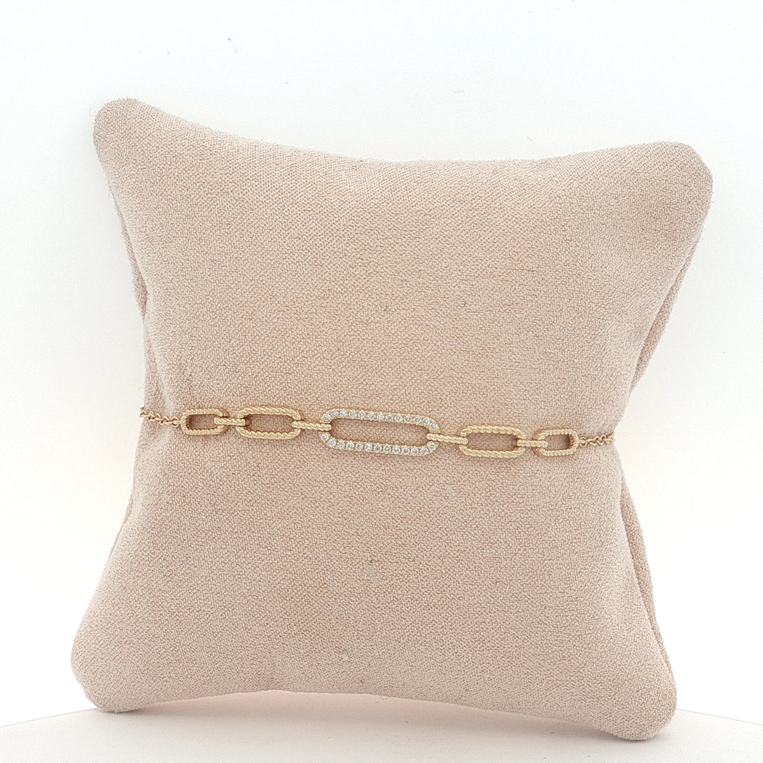 Esta pulsera de eslabones está elaborada en oro amarillo 14KT y embellecida con diamantes naturales (0.12 ct total)que iluminan cada enlace con un brillo sutil y sofisticado. Su estructura firme y femenina la convierte en una pieza icónica para llevar sola o en layering. ✨