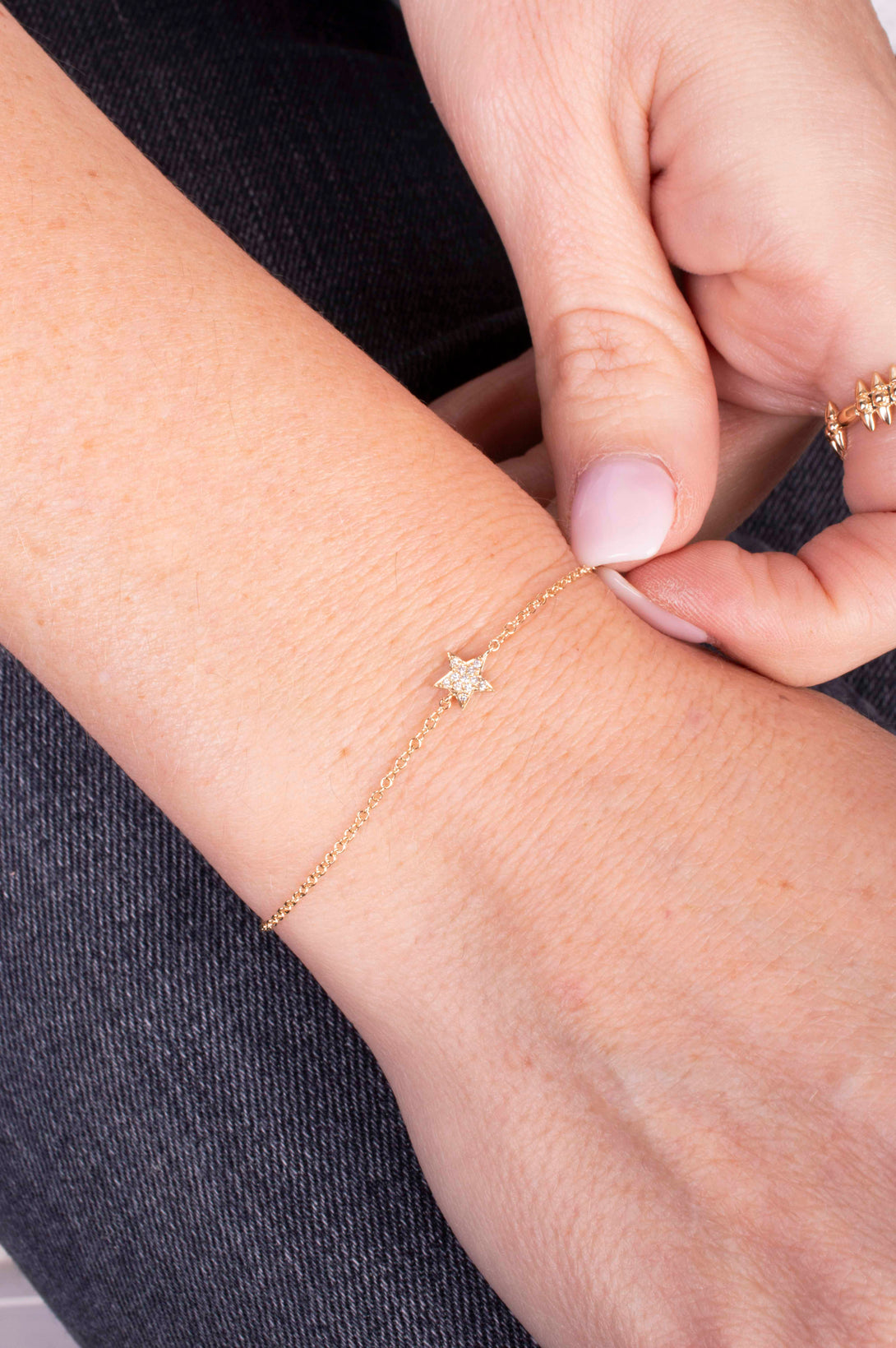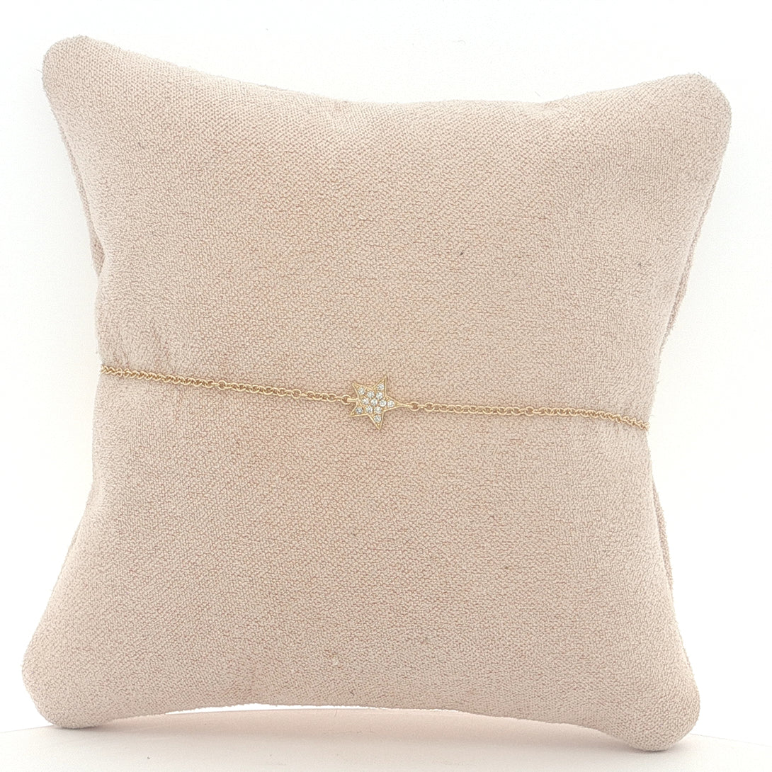 Esta pulsera con dije de estrella, elaborada en oro amarillo 14KT, está delicadamente engastada con diamantes naturales que reflejan la luz con cada movimiento. Su diseño minimalista y su ajuste fino la convierten en una pieza perfecta para llevar todos los días —sola o en layering con otras pulseras. ✨