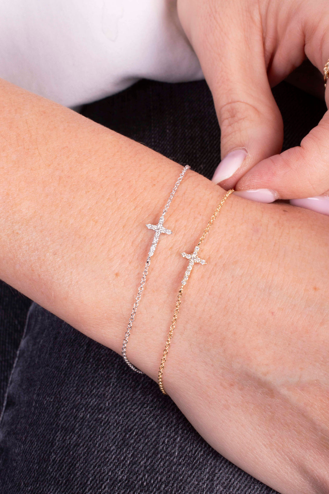 Esta pulsera con cruz está elaborada en oro blanco 14KT y decorada con diamantes naturales (0.08 ct total) que reflejan una luz sutil y elegante. Perfecta para quienes buscan una pieza con significado espiritual y estilo atemporal. ✨