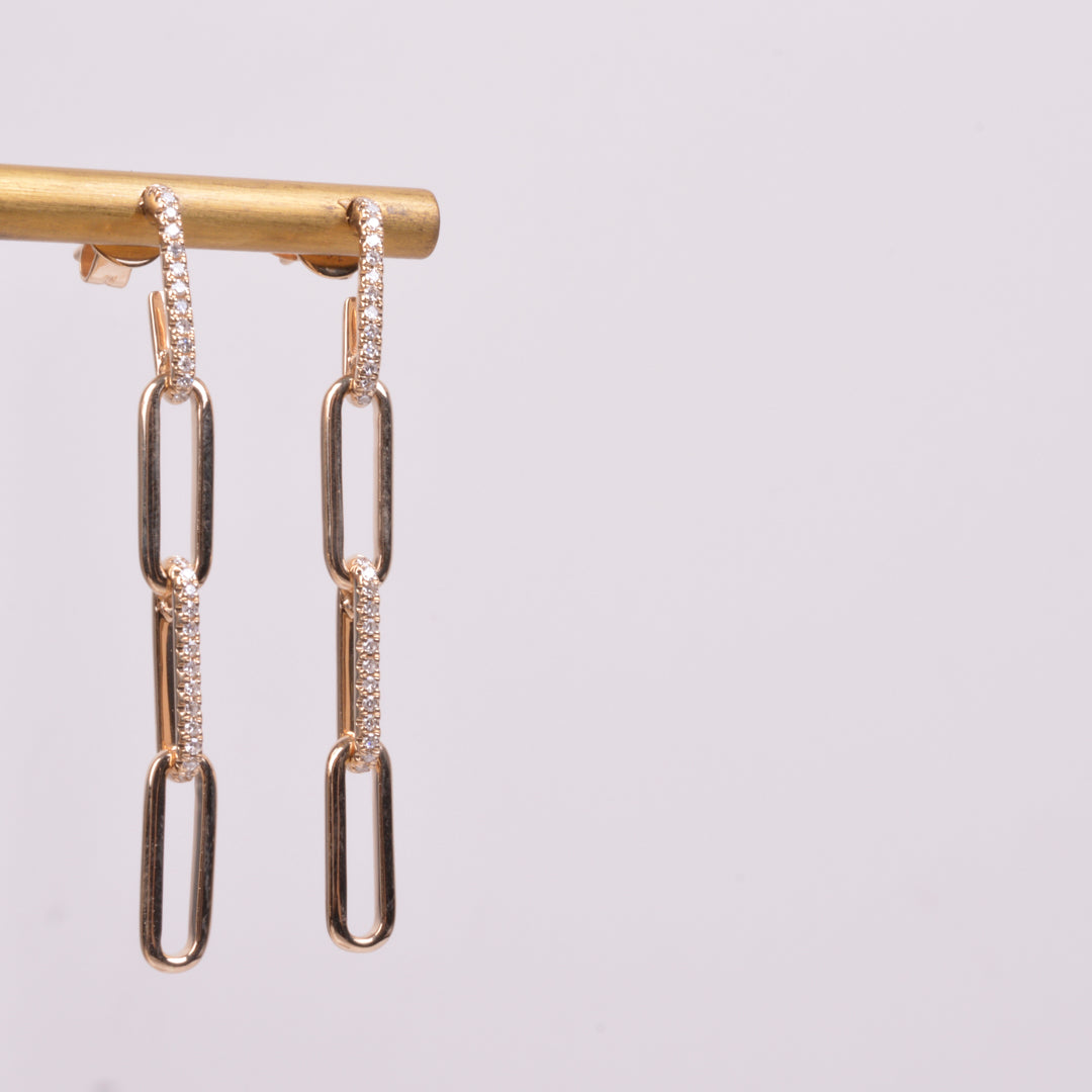 Estos aretes en oro amarillo 14KT están engastados con 52 diamantes redondos naturales (0.14 ct total) que recorren cada eslabón con un brillo delicado pero impactante. Con un peso de 3.31 g, son un statement sutil y elegante que transforma cualquier look, del día a la noche.