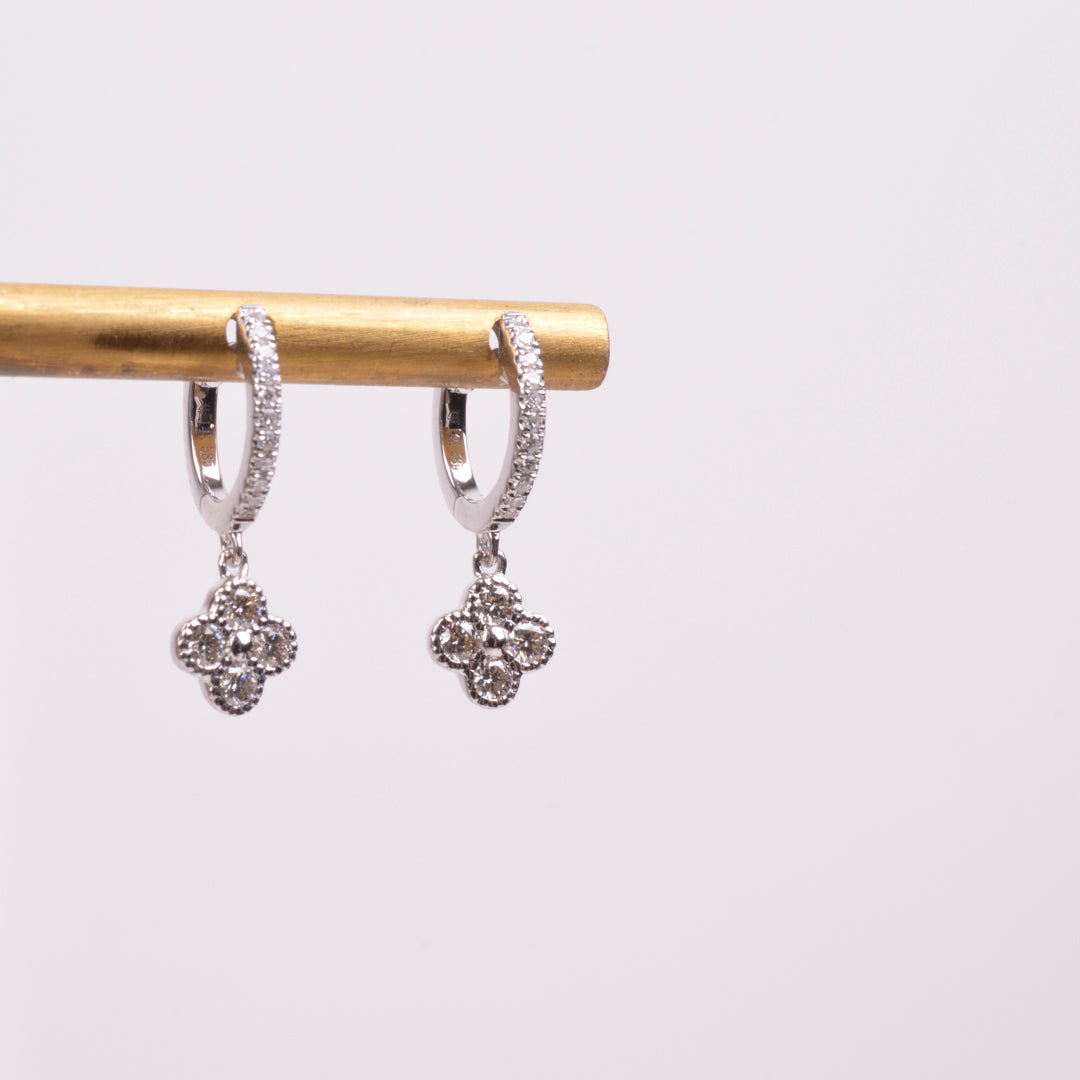 Estas arracadas en oro blanco 14KT están engastadas con 8 diamantes redondos naturales (0.23 ct total) combinados con 22 diamantes redondos naturales (0.07 ct total) que iluminan el trébol en cada ángulo. Con un peso de 1.75 g y diámetro de 10 mm, son el equilibrio perfecto entre lujo atemporal y amuleto chic.