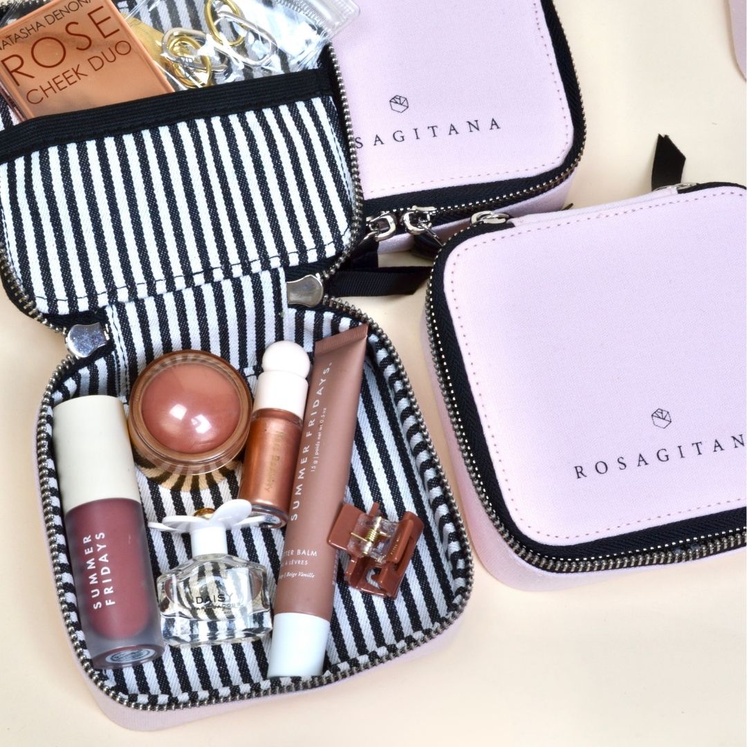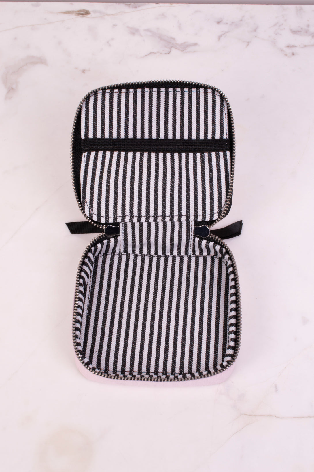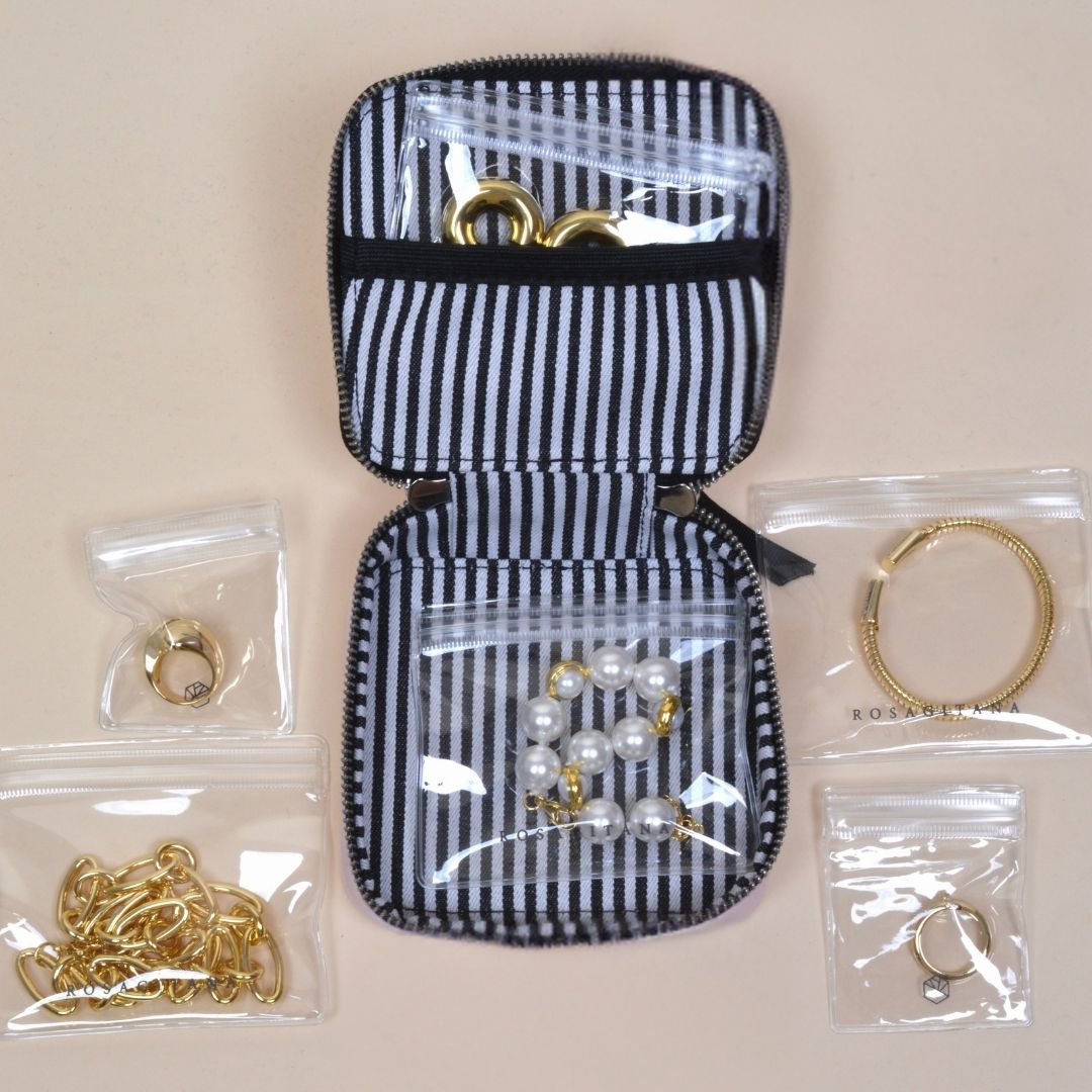 Un joyero versátil, chic y práctico diseñado por Rosagitana. Su interior con forro a rayas y cierre de doble vista lo convierte en el accesorio ideal para mantener tu joyería siempre organizada. Está pensado para usarse junto con las bolsitas de plástico resellables que entregamos con cada pieza, pero también puedes darle otros usos: guardar maquillaje, skincare, accesorios pequeños o esenciales de viaje.
